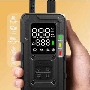 Low tire light? No prob. Inflates in about a min and hits up to 160 PSI. That’s plenty for SUVs, bikes and light trucks. The built-in gauge is easy to read, even in the dark.