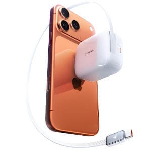 Dump the cable chaos. The built-in retractable USB-C cable pulls out almost 40 inches. Plus, a second port can fast-charge your laptop at the same time. One block, fewer headaches.
