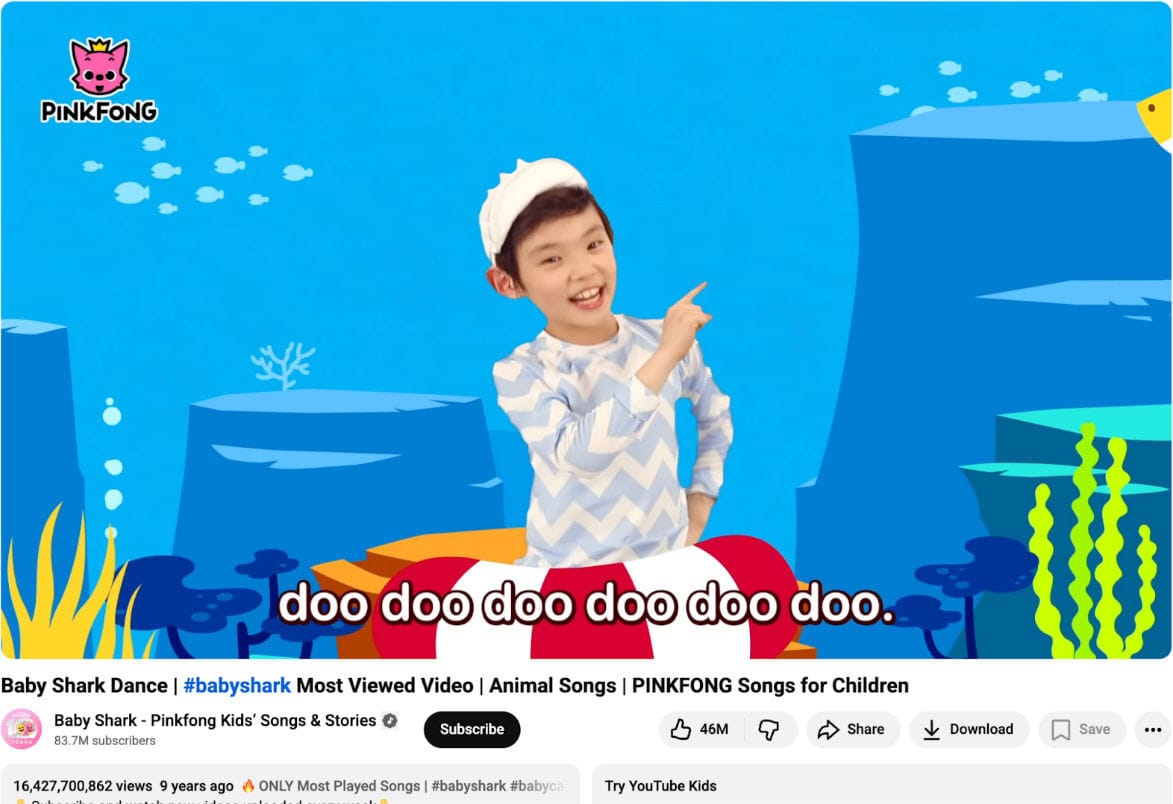 Baby Shark has 16.4 billion plays (paywall link), about 10 of T-Swiftâs top 10 YouTube videos combined.
