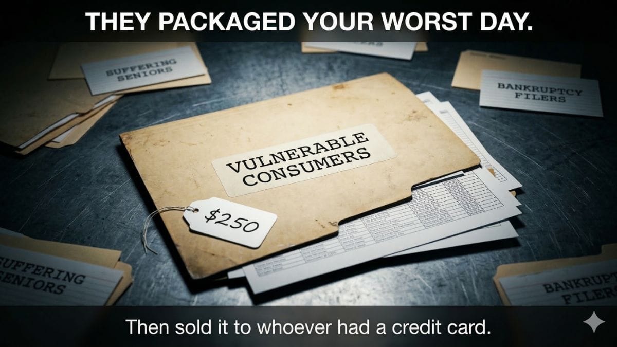 Predatory lenders buy lists of people in financial distress to pitch 300% interest loans to families already drowning. Scammers specifically buy lists of recently widowed women, because they assume there’s a life insurance payout and someone navigating money alone for the first time.